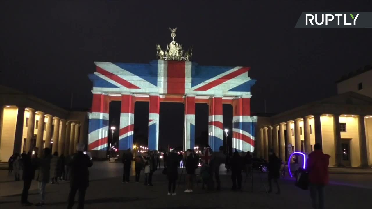 Brama Brandenburska oświetlona w kolorach brytyjskiej flagi